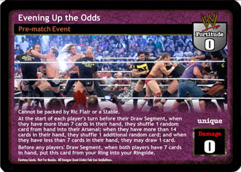 Cannot be packed by Ric Flair or by a Stable. At the start of each player's turn before their Draw Segment, when they have more than 7 cards in their hand, they shuffle 1 random card from hand into their Arsenal; when they have more than 14 cards in their hand, they shuffle 1 random additional card; and when they have less than 7 cards in their hand, they may draw 1 card. Before any players' Draw Segment, when both players have 7 cards in hand, put this card from your Ring into your Ringside.