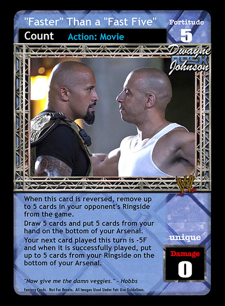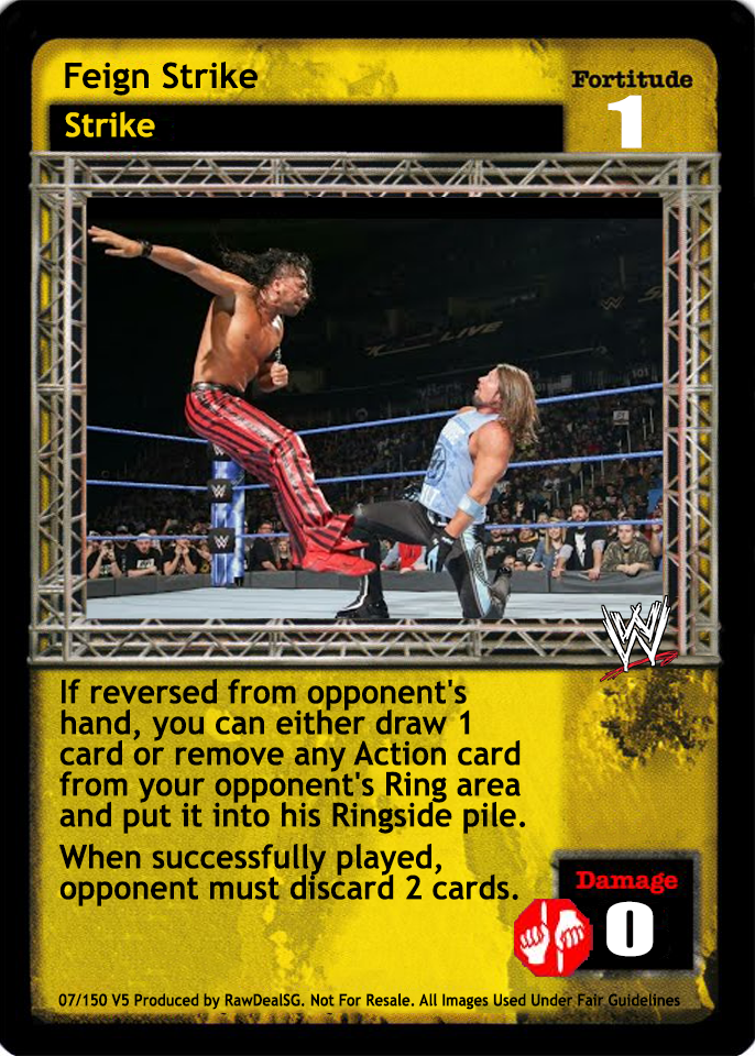 If reversed from opponent's hand, you can either draw 1 card or remove any Action card from your opponent's Ring area and put it into his Ringside pile. When successfully played, opponent must discard 2 cards.