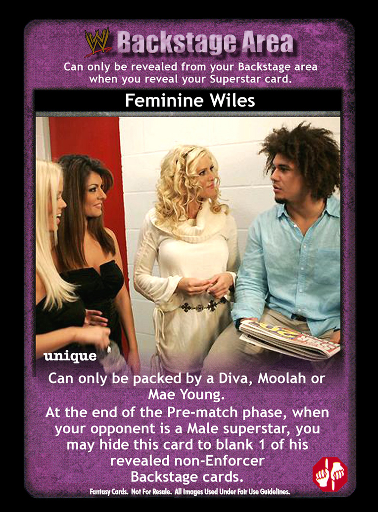 Can only be packed by a Diva, or by Moolah or Mae Young. At the end of the Pre-match phase, when your opponent is a Male superstar, you may hide this card to blank on of his revealed non-Enforcer Backstage cards.