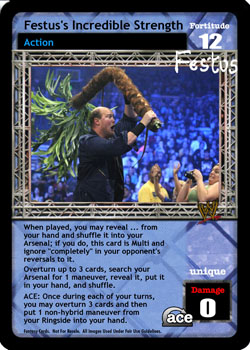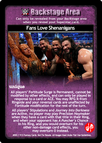 All players’ Fortitude Surge is Permanent, cannot be modified by other effects, and can only be played in response to a card or ACE. You may RFG it from Ringside and your reversal cards are unaffected by Fortitude modification for the rest of the turn. All players’ Stipulations and Journey Into Darkness are Active, no player may play Precision Haymaker when they have a card with that title in their Ring, and when your opponent has A Puncher's Chance in his Ring, do not overturn for his other non-damage card effects.