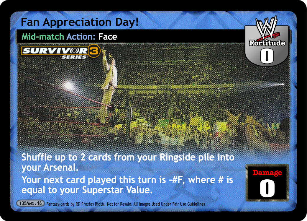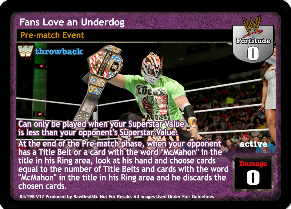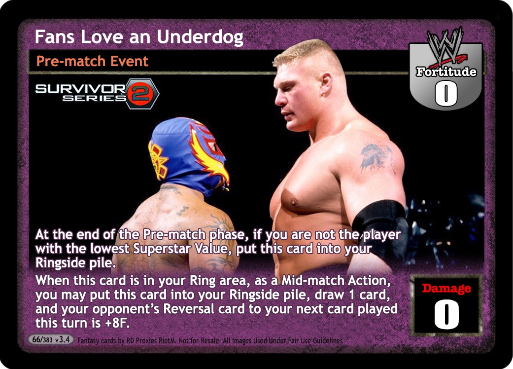 At the end of the Pre-match phase, if you are not the player with the lowest Superstar Value, put this card into your Ringside pile. When this card is in your Ring area, as a Mid-match Action, you may put this card into your Ringside pile, draw 1 card, and your opponent's Reversal card to your next card played this turn is +8F.