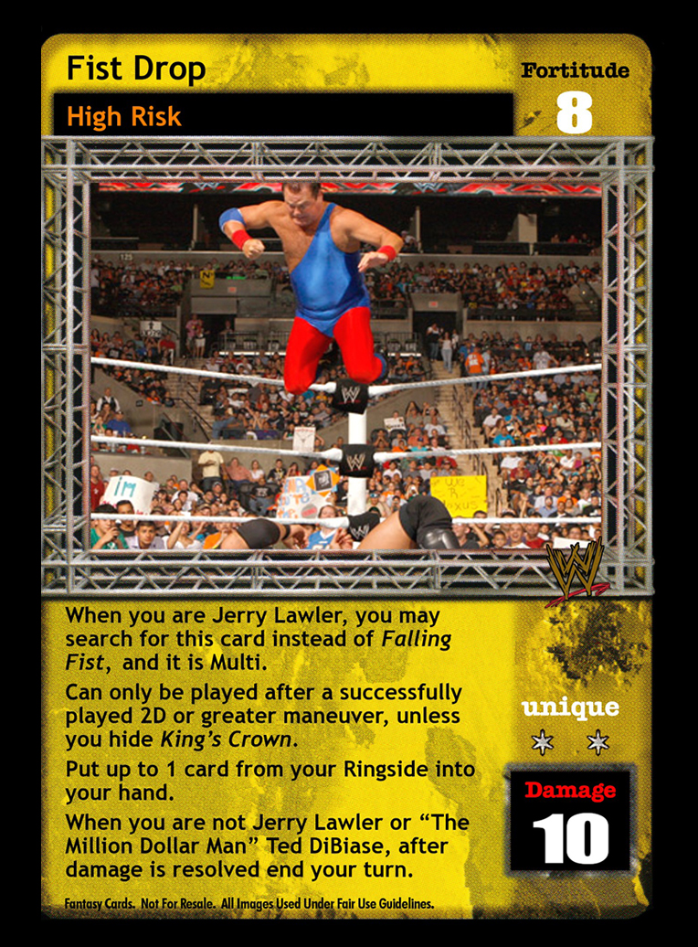 When you are Jerry Lawler, you may search for this card instead of Falling Fist, and it is Multi. Can only be played after a successfully played 2D or greater maneuver, unless you hide King's Crown. Put up to 1 card from your Ringside into your hand. When you are not Jerry Lawler or 'The Million Dollar Man' Ted DiBiase, after damage is resolved end your turn.
