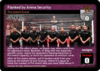 During the Pre-match phase, no player may move cards from his opponent's hand, Backlash, or Ring with non-Superstar-specific cards; reduce his opponent's Starting Hand Size or Pre-match Capacity; or force his opponent to overturn cards. After all Pre-match phases, put # random cards from your hand on the bottom of your Arsenal, where # is equal to twice the number of Pre-match slots you have filled above 5.