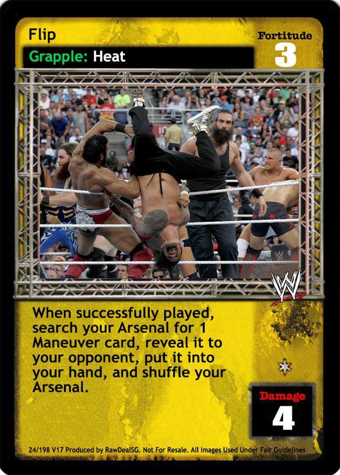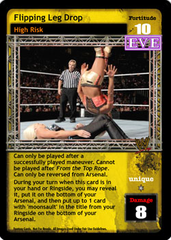 Can only be played after a successfully played maneuver. Cannot be played after From the Top Rope. Can only be reversed from Arsenal. During your turn when this card is in your hand or Ringside, you may reveal it, put it on the bottom of your Arsenal, and then put up to 1 card with 'moonsault' in the title from your Ringside on the bottom of your Arsenal.