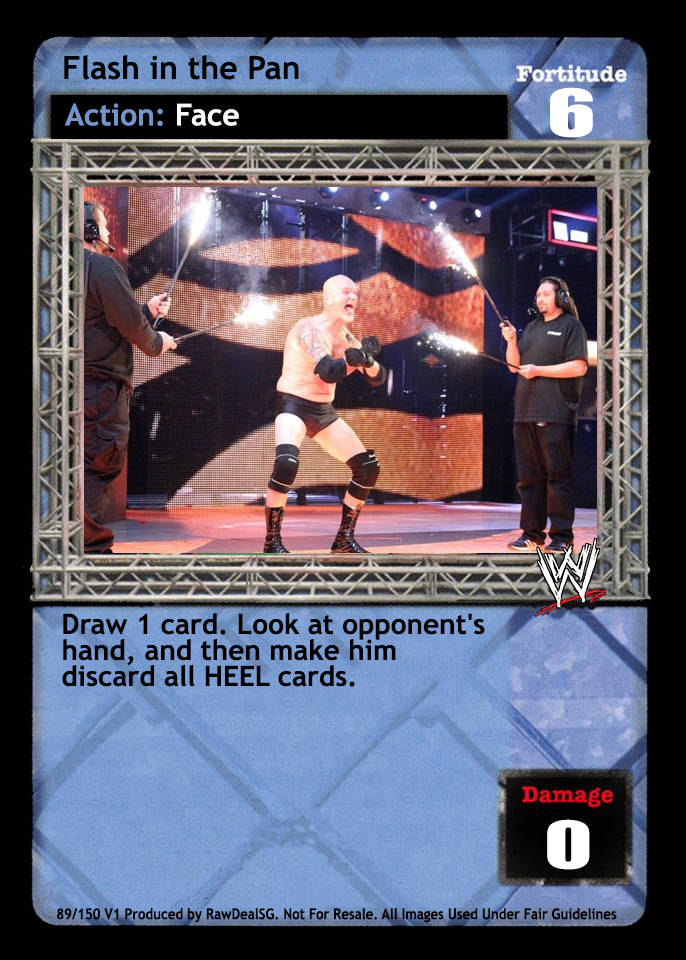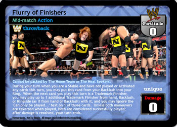 Cannot be packed by The Home Team or The Heat Seekers. During your turn when you are a Stable and have not played or Activated any cards this turn, you may put this card from your Backlash into your Ring. When the next card you play this turn is a Trademark Finisher, you may play up to 1 additional Trademark Finisher from hand, Backlash, or Ringside (as if from hand or Backlash) with it, and you may ignore the 'Can only be played...' text on 1 of those cards. Unless both maneuvers are reversed when played, both are considered successfully played; after damage is resolved, your turn ends.