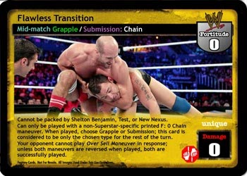 Cannot be packed by Shelton Benjamin, Test, or New Nexus. Can only be played with a non-Superstar-specific printed F: 0 Chain maneuver. When played, choose Grapple or Submission; this card is considered to be only the chosen type for the rest of the turn. Your opponent cannot play Over Sell Maneuver in response; unless both maneuvers are reversed when played, both are successfully played.