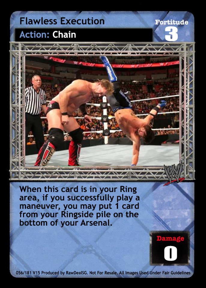 When this card is in your Ring area, if you successfully play a maneuver, you may put 1 card from your Ringside pile on the bottom of your Arsenal.