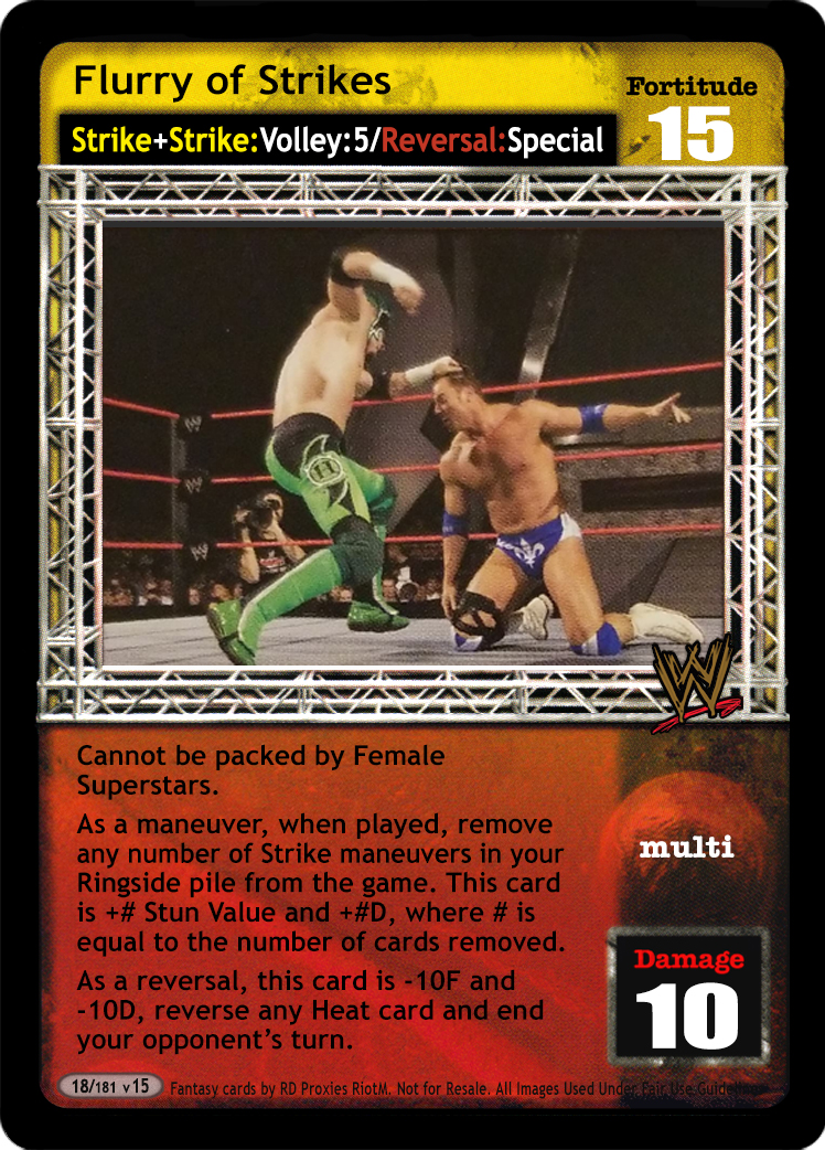 As a maneuver, when played, remove any number of Strike maneuvers in your Ringside pile from the game. This card is +# Stun Value and +#D, where # is equal to the number of cards removed. As a reversal, this card is -10F and -10D, reverse any Heat card and end your opponent's turn.