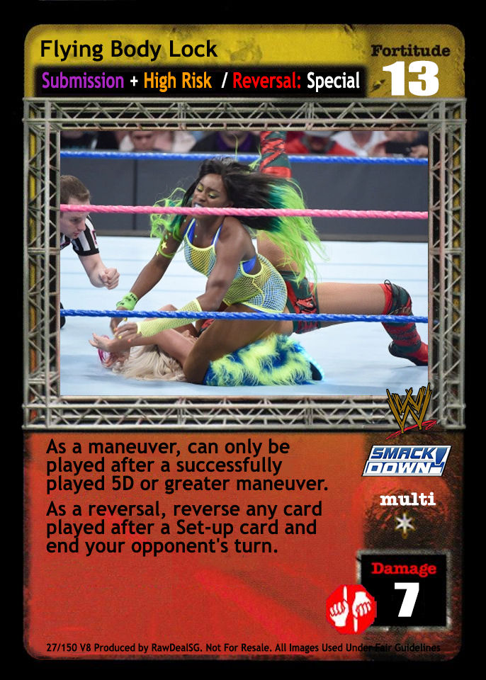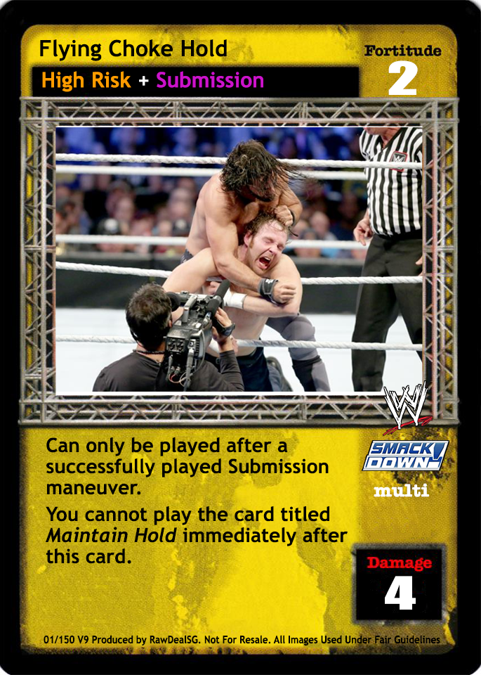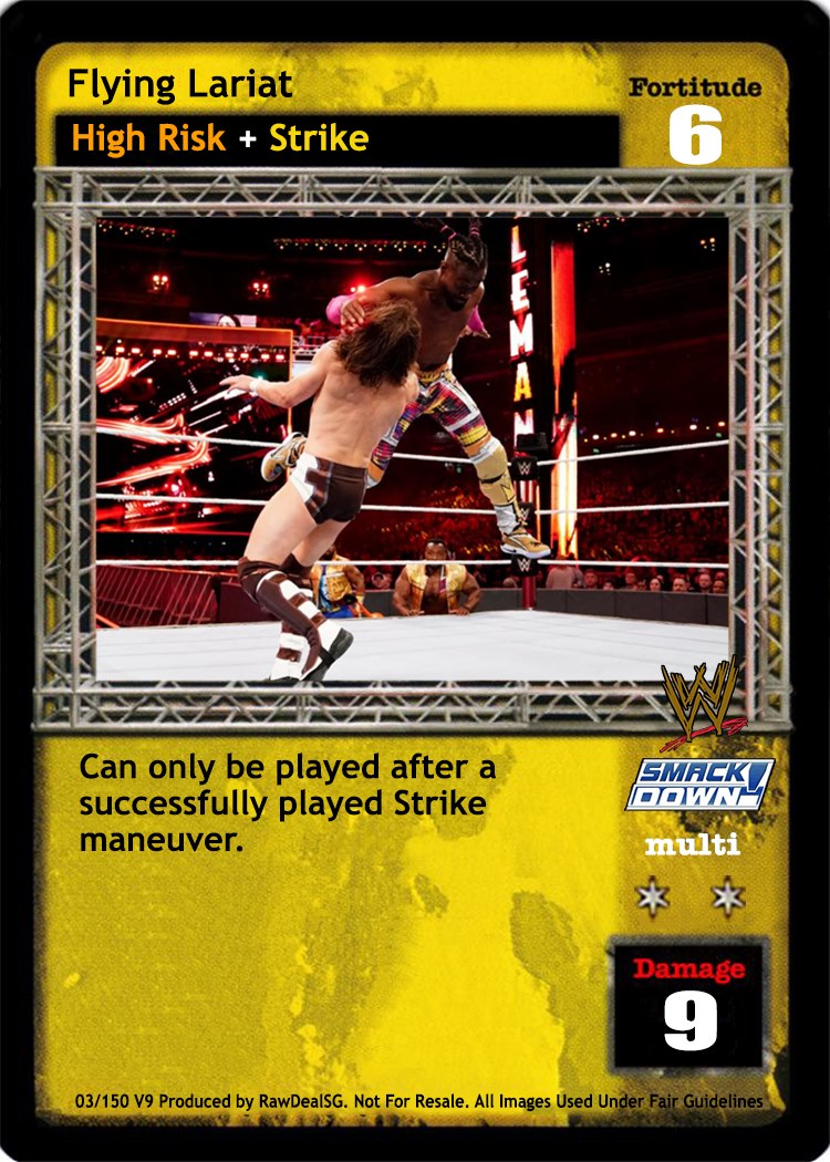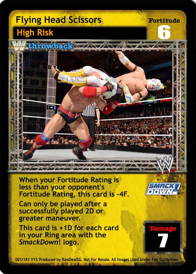 When your Fortitude Rating is less than your opponent's Fortitude Rating, this card is -4F. Can only be played after a successfully played 2D or greater maneuver. This card is +1D for each card in your Ring area with the SmackDown! logo.