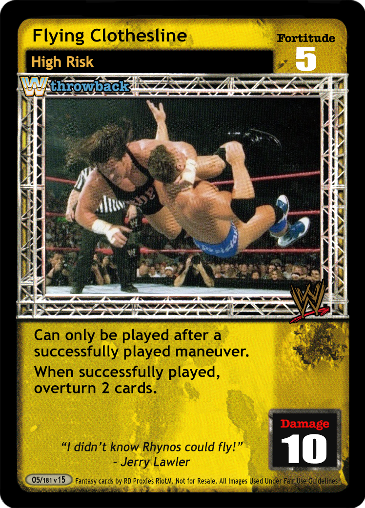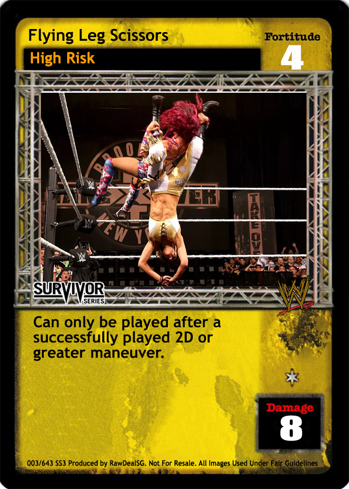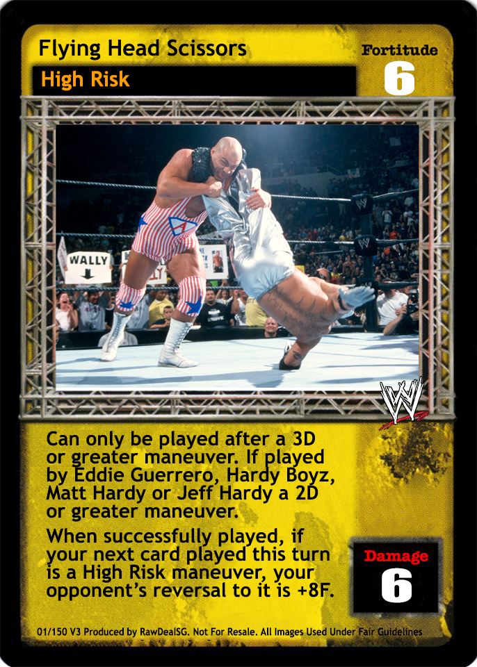 Can only be played after a 3D or greater maneuver. If played by Eddie Guerrero, Hardy Boyz, Matt Hardy or Jeff Hardy a 2D or greater maneuver. When successfully played, if your next card played this turn is a High Risk maneuver, your opponent's reversal to it is +8F.
