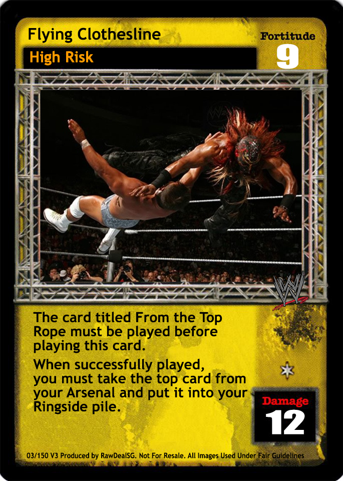 The card titled From the Top Rope must be played before playing this card. When successfully played, you must take the top card from your Arsenal and put it into your Ringside pile.