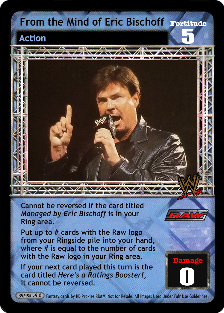 Cannot be reversed if the card titled Managed by Eric Bischoff is in your Ring area. Put up to # cards with the Raw logo from your Ringside pile into your hand, where # is equal to the number of cards with the Raw logo in your Ring area. If your next card played this turn is the card titled Here's a Ratings Booster!, it cannot be reversed.
