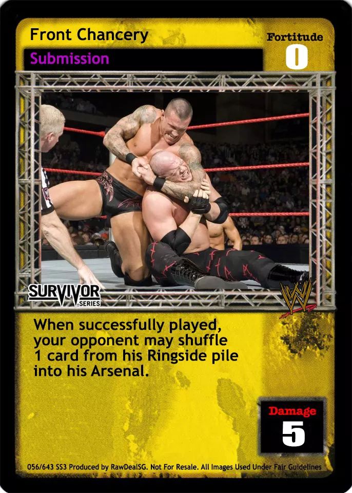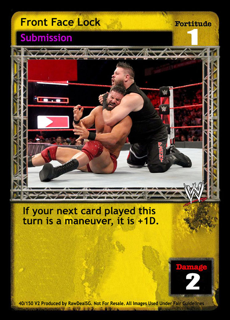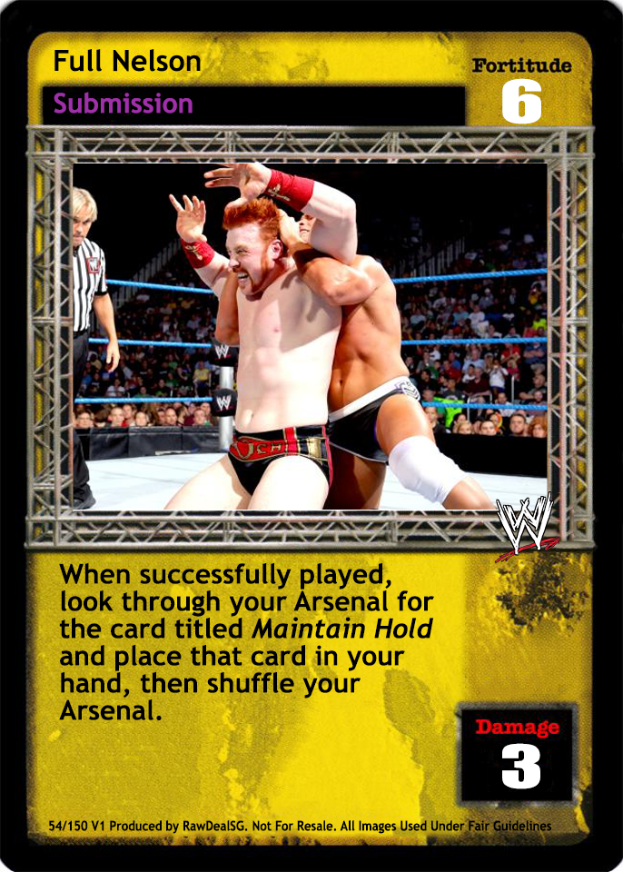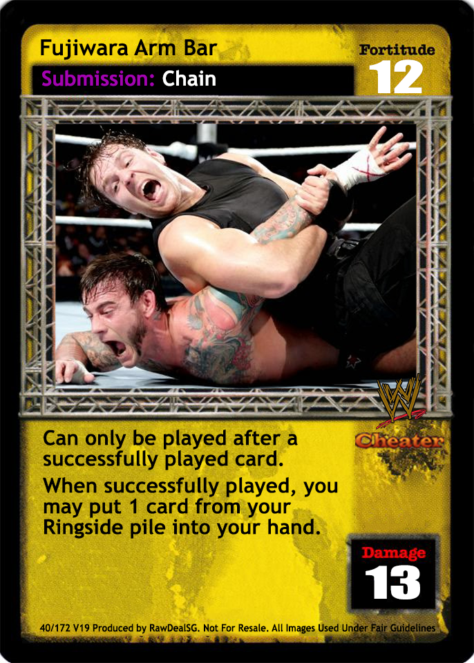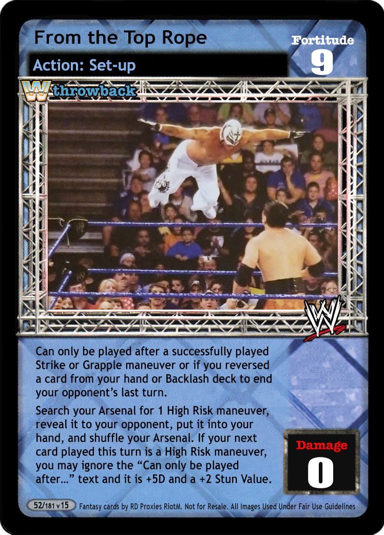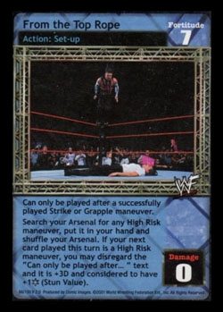 Can only be played after a successfully played Strike or Grapple maneuver. Search your Arsenal for 1 High Risk maneuver, reveal it to your opponent, put it into your hand, and shuffle your Arsenal. If your next card played this turn is a High Risk maneuver, you can ignore the "Can only be played after..." text, it is +3D and +1 Stun Value.