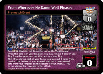 Cannot be blanked; can be played during the Venue phase. When this card is in your Ringside, you may remove 1 card in your Ring from the game, and put this card into your Ring. ACE: Once during each of your turns, you may put 2 cards from hand on the bottom of your Arsenal, and put 1 non-reversal card from your Ringside on the bottom of your Arsenal. You do not discard to reversals to this effect.