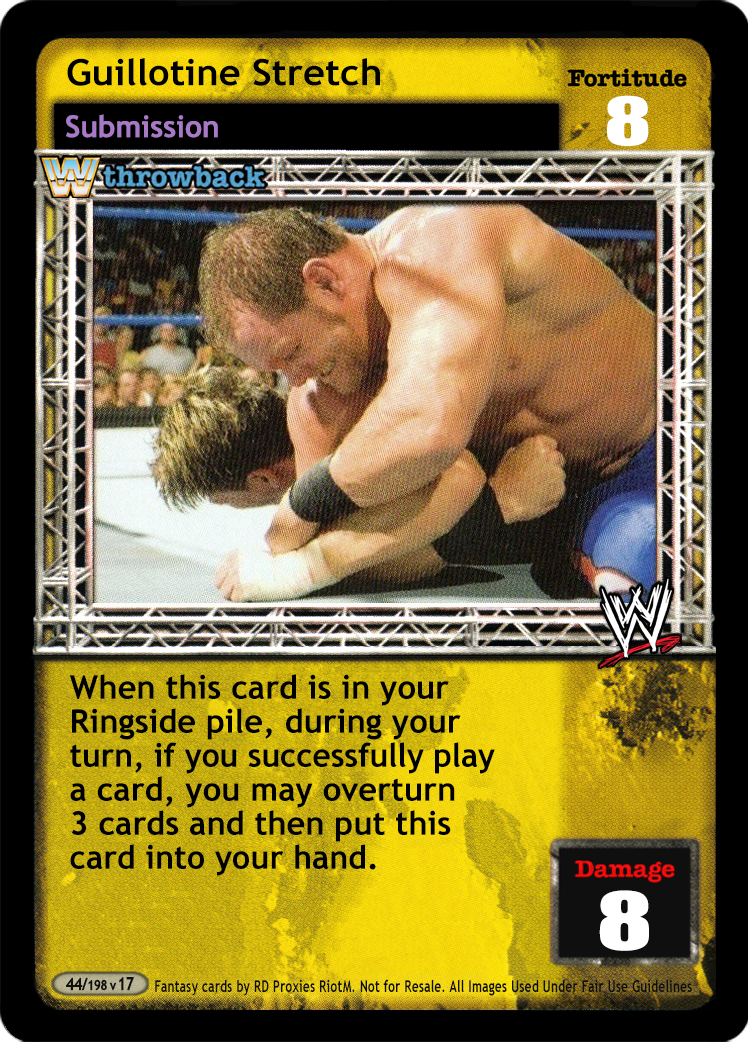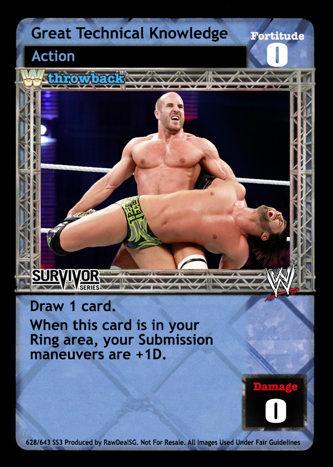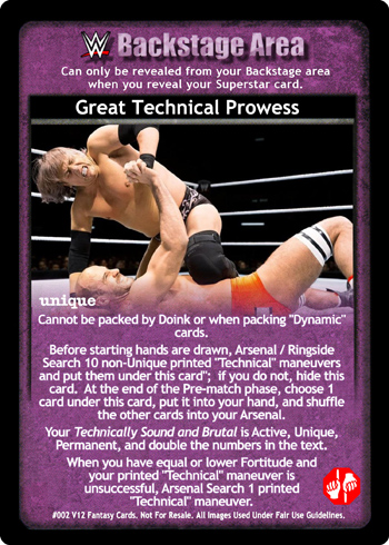 Cannot be packed by Doink or when packing Dynamic cards. Before starting hands are drawn, Arsenal / Ringside Search 10 non-Unique printed Technical maneuvers, put them under this card, and shuffle; if you do not, hide this card. At the end of the Pre-match Phase, choose 1 card under this card, put it into your hand, and shuffle the other cards into your Arsenal. Your Technically Sound and Brutal is Active, Unique, Permanent, and double the numbers in the text. When you have equal or lower Fortitude and your printed Technical maneuver is unsuccessful, Arsenal Search 1 printed Technical maneuver.