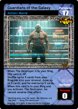 When The Destroyer is in your Ring, this card is -5F. Shuffle up to 5 cards from your Ringside into your Arsenal, draw up to 5 cards, and he overturns 5 cards. When this card is in your Ring and you Activate The Destroyer, he cannot reverse that effect.