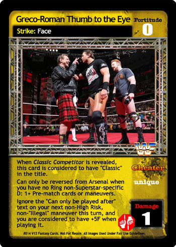 When Classic Competitor is revealed, this card is considered to have Classic in the title. Can only be reversed from Arsenal when you have no Ring non-Superstar-specific D: 1+ Pre-match cards or maneuvers. Ignore the Can only be played after text on your next non-High Risk, non-Illegal maneuver this turn, and you are considered to have +5F when playing it.