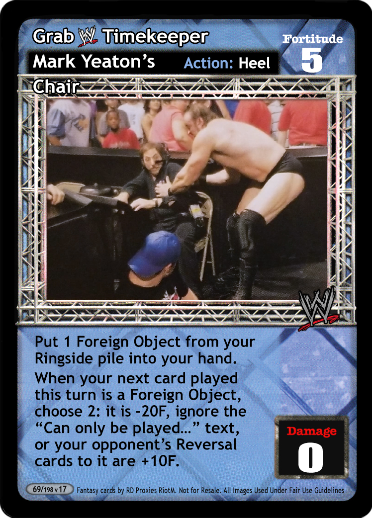 Put 1 Foreign Object from your Ringside pile into your hand. When your next card played this turn is a Foreign Object, choose 2: it is -20F, ignore the "Can only be played..." text, or your opponent's Reversal cards to it are +10F.