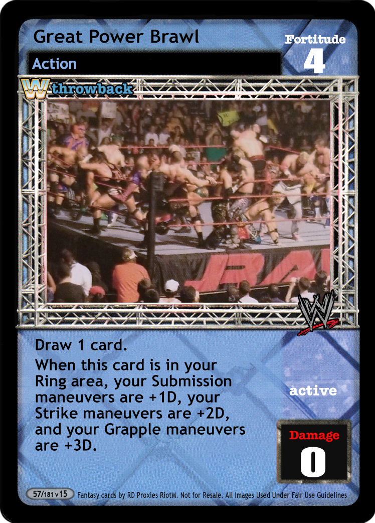 When this card is in your Ring area, your Submission maneuvers are +1D, your Strike maneuvers are +2D, and your Grapple maneuvers are +3D.