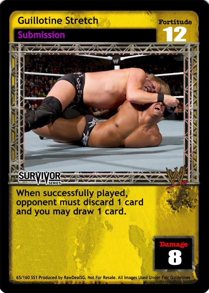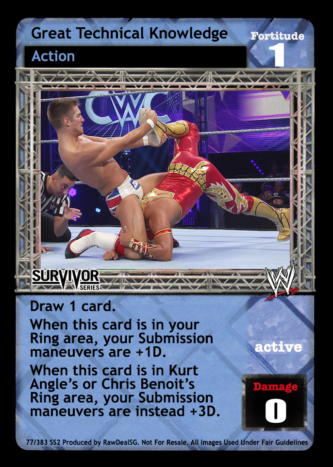 When this card is in your Ring area, your Submission maneuvers are +1D. When this card is in Kurt Angle's or Chris Benoit's Ring area, your Submission maneuvers are instead +3D.