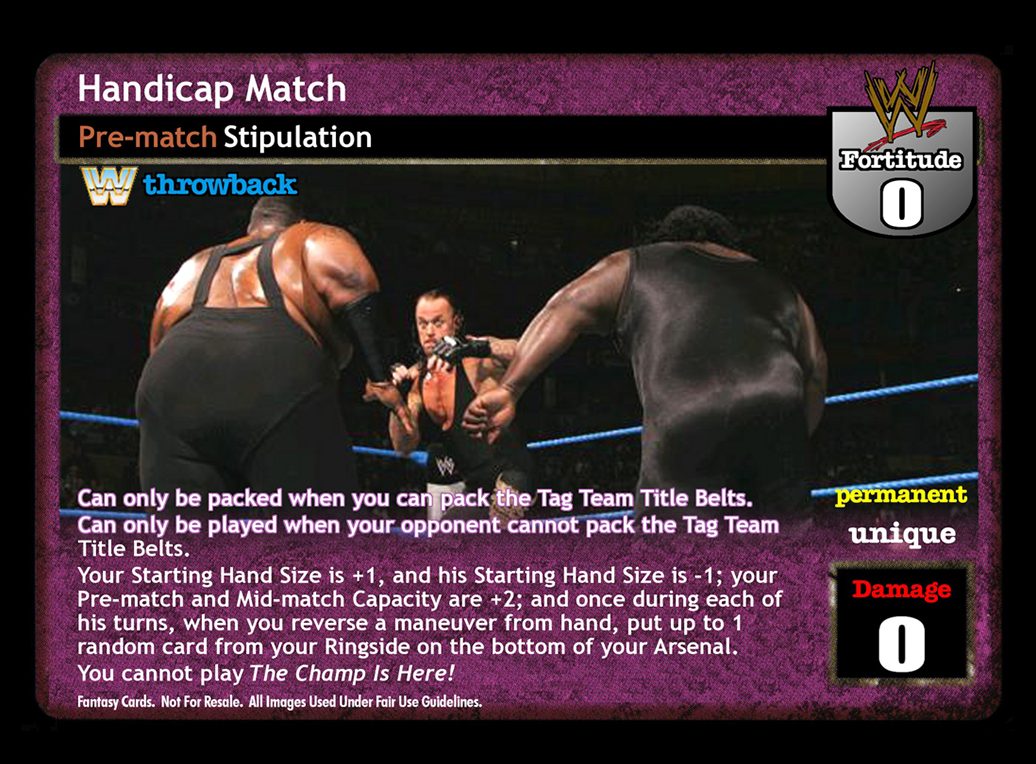 Can only be packed when you can pack the Tag Team Title Belts. Can only be played when your opponent cannot pack the Tag Team Title Belts. Your Starting Hand Size is +1, and his Starting Hand Size is -1; your Pre-match and Mid-match Capacity are +2; and once during each of his turns, when you reverse a maneuver from hand, put up to 1 random card from your Ringside on the bottom of your Arsenal. You cannot play The Champ Is Here.