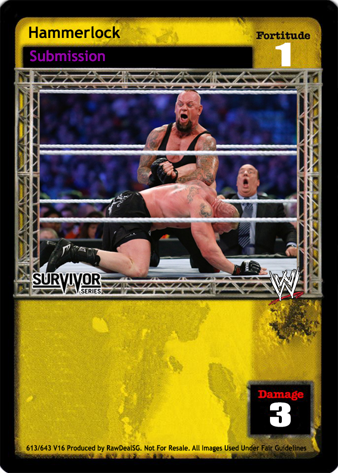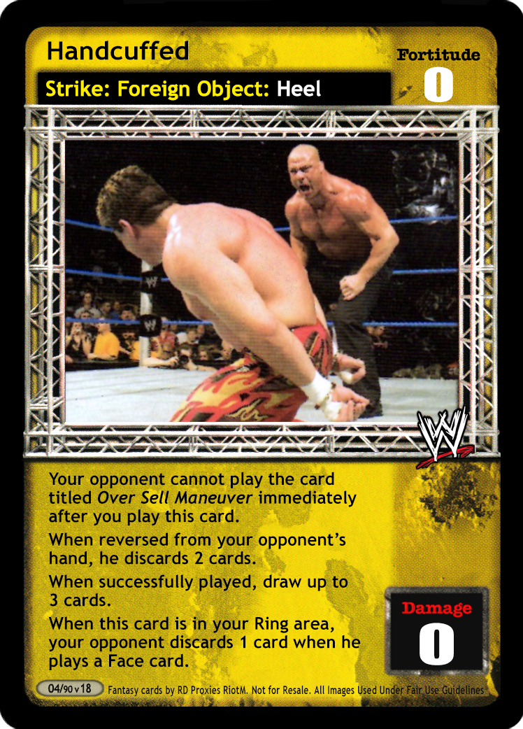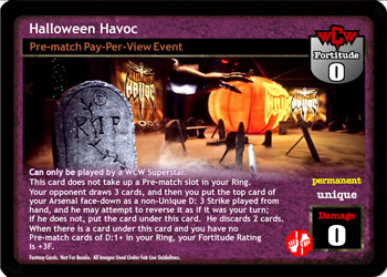 Can only be played by a WCW Superstar. This card does not take up a Pre-match slot in your Ring. Your opponent draws 3 cards, and then you put the top card of your Arsenal face-down as a non-Unique D: 3 Strike played from hand, and he may attempt to reverse it as if it was your turn; if he does not, put the card under this card. He discards 2 cards. When there is a card under this card and you have no Pre-match cards of D:1+ in your Ring, your Fortitude Rating is +3F.