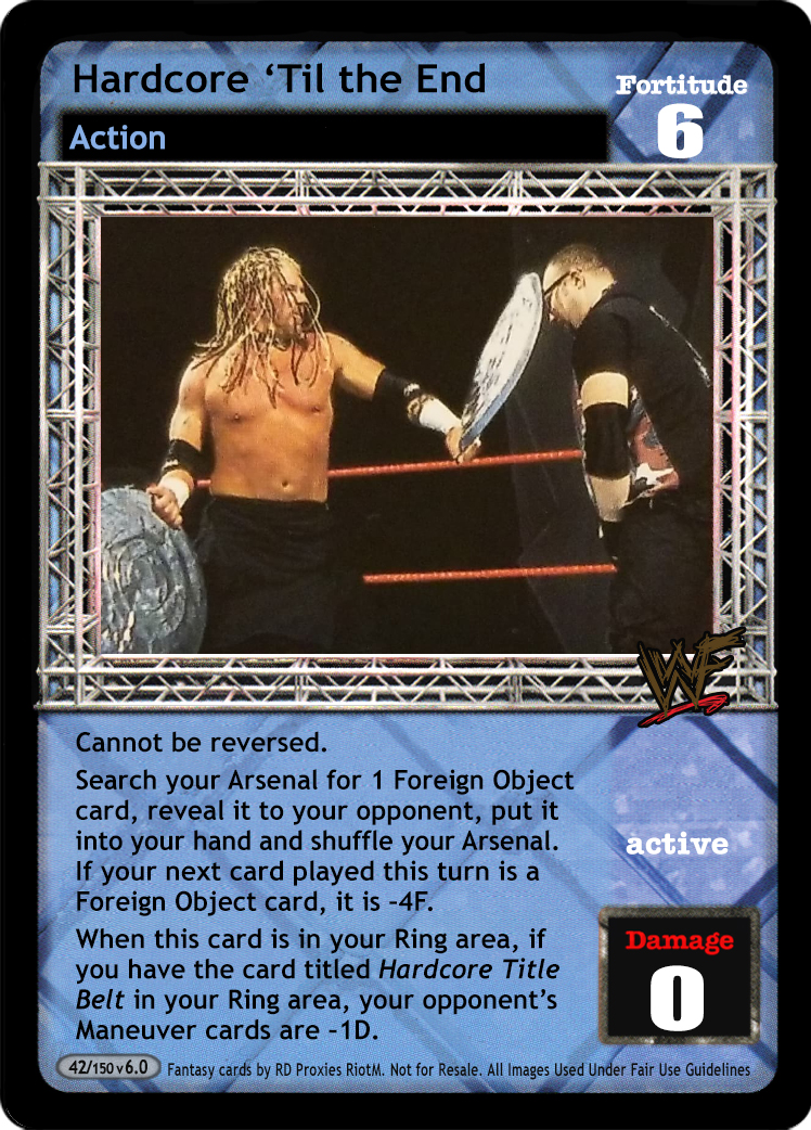 Cannot be reversed. Search your Arsenal for 1 Foreign Object card, reveal it to your opponent, put it into your hand, and shuffle your Arsenal. If your next card played this turn is a Foreign Object card, it is -4F. When this card is in your Ring area, if you have the card titled Hardcore Title Belt in your Ring area, your opponent's Maneuver cards are -1D.