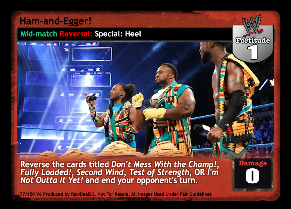 Reverse the cards titled Don't Mess With the Champ!, Fully Loaded!, Second Wind, Test of Strength, OR I'm Not Outta It Yet! and end your opponent's turn.