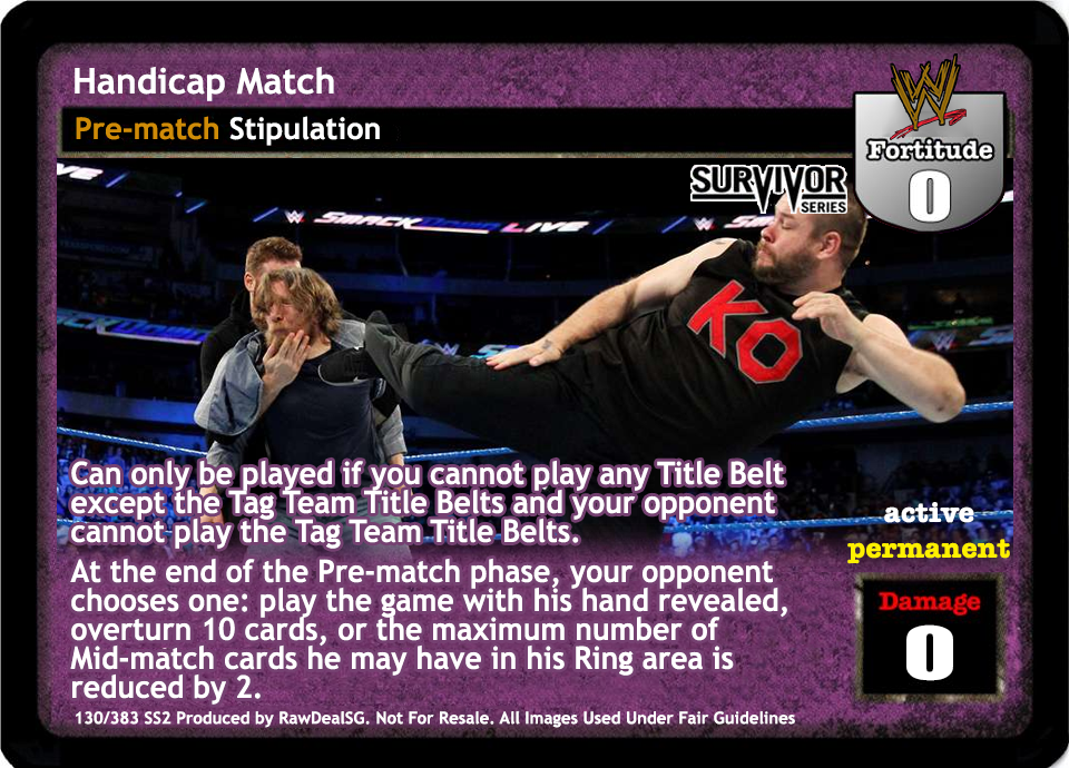 Can only be played if you cannot play any Title Belt except the Tag Team Title Belts and your opponent cannot play the Tag Team Title Belts. At the end of the Pre-match phase, your opponent chooses one: play the game with his hand revealed, overturn 10 cards, or the maximum number of Mid-match cards he may have in his Ring area is reduced by 2.