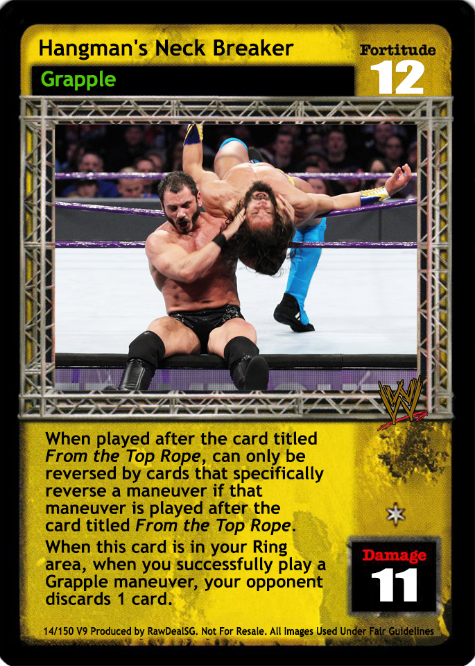 When played after the card titled From the Top Rope, can only be reversed by cards that specifically reverse a maneuver if that maneuver is played after the card titled From the Top Rope. When this card is in your Ring area, when you successfully play a Grapple maneuver, your opponent discards 1 card.