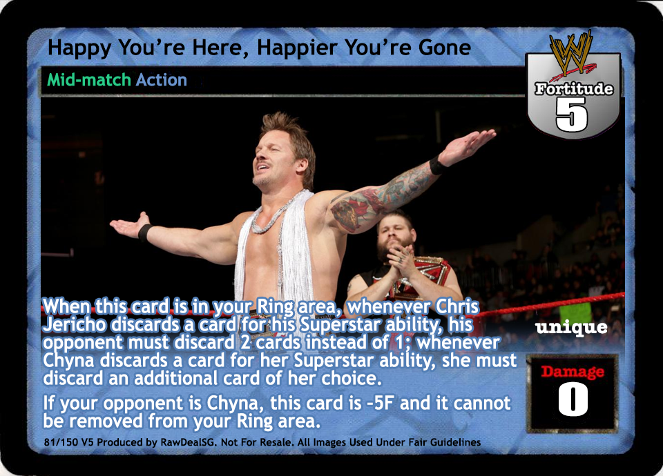 When this card is in your Ring area, whenever Chris Jericho discards a card for his Superstar ability, his opponent must discard 2 cards instead of 1; whenever Chyna discards a card for her Superstar ability, she must discard an additional card of her choice. If your opponent is Chyna, this card is -5F and it cannot be removed from your Ring area.