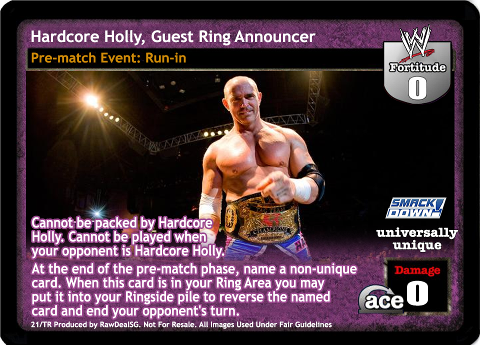 Cannot be packed by Hardcore Holly. Cannot be played when your opponent is Hardcore Holly. At the end of the Pre-match phase, name a non-unique card. When this card is in your Ring area, you may put it into your Ringside pile to reverse the named card and end your opponent's turn.