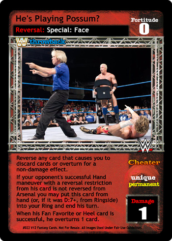 Reverse any card that causes you to discard cards or overturn for a non-Damage effect. If your opponent's successful Hand maneuver with a reversal restriction from his card is not reversed from Arsenal you may put this card from hand (or, if it was D:7+, from Ringside) into your Ring and end his turn. When his Fan Favorite or Heel card is successful, he overturns 1 card.