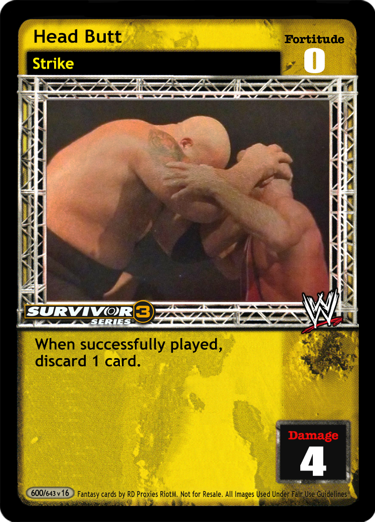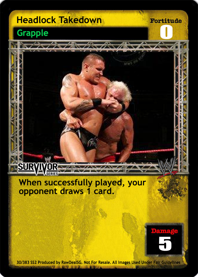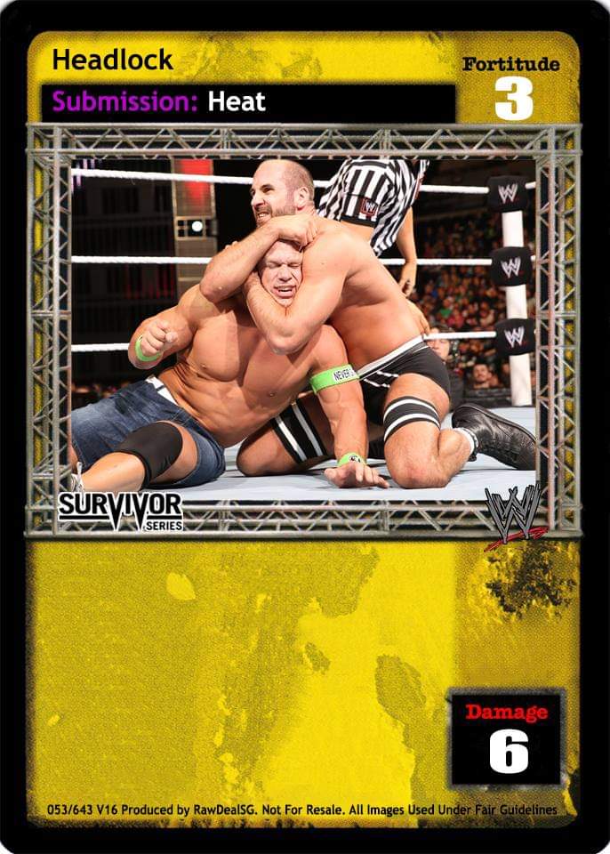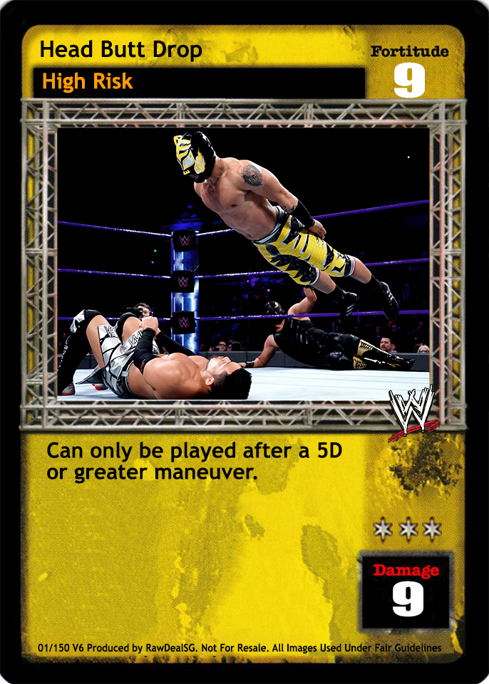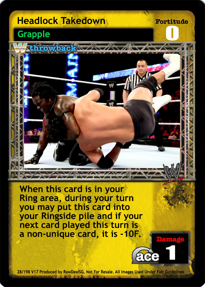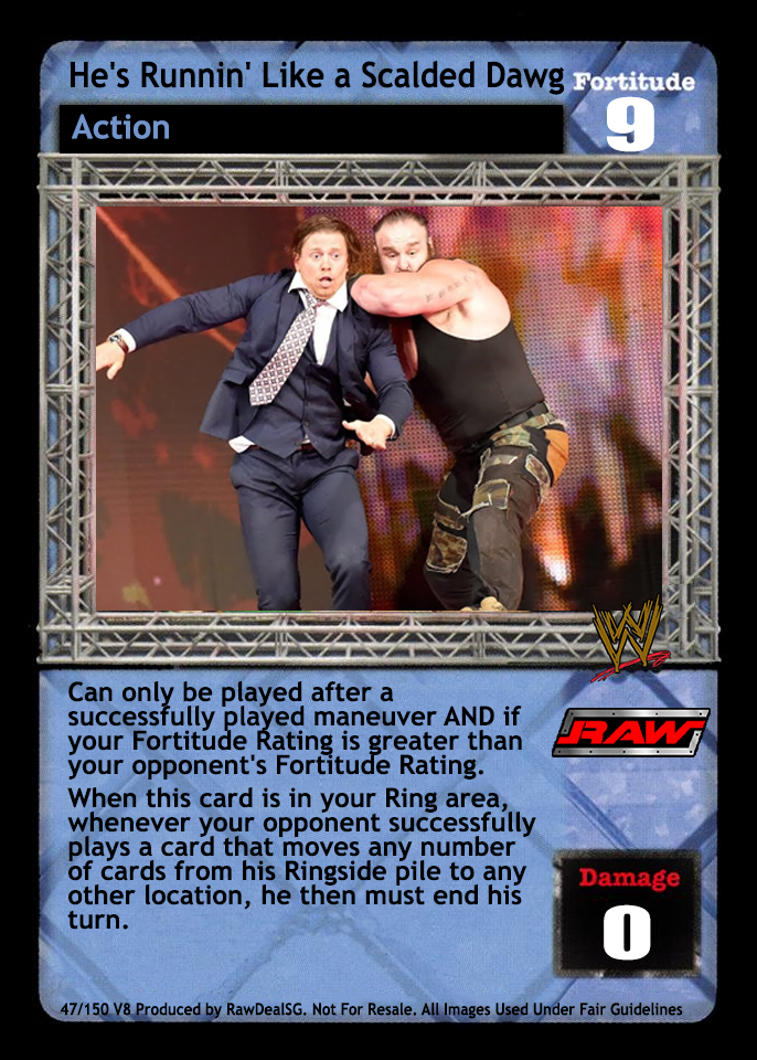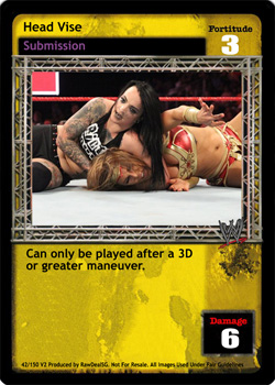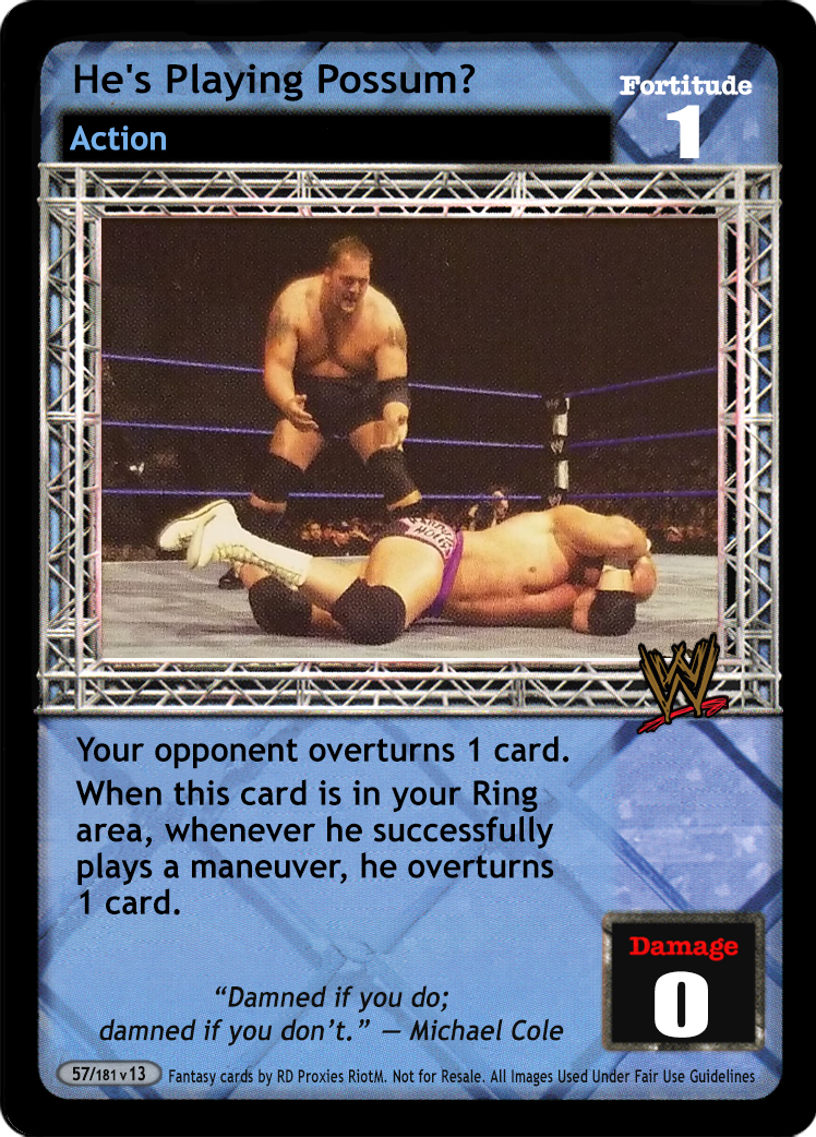 Can only be played after a successfully played maneuver AND if your Fortitude Rating is greater than your opponent's Fortitude Rating. When this card is in your Ring area, whenever your opponent successfully plays a card that moves any number of cards from his Ringside pile to any other location, he then must end his turn.
