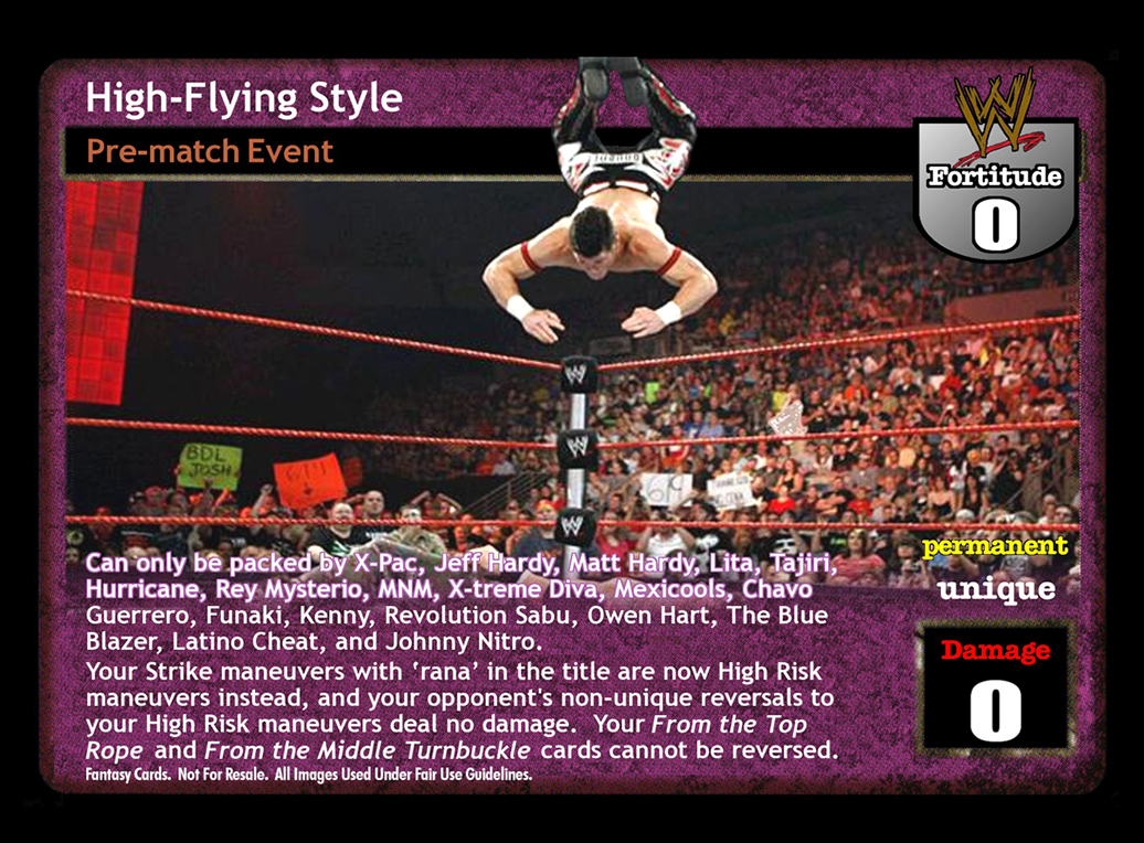 Can only be packed by X-Pac, Jeff Hardy, Matt Hardy, Lita, Tajiri, Hurricane, Rey Mysterio, MNM, X-treme Diva, Mexicools, Chavo Guerrero, Funaki, Kenny, Revolution Sabu, Owen Hart, The Blue Blazer, Latino Cheat, and Johnny Nitro. Your Strike maneuvers with µrana' in the title are now High Risk maneuvers instead, and your opponent's non-unique reversals to your High Risk maneuvers deal no damage. Your From the Top Rope and From the Middle Turnbuckle cards cannot be reversed.