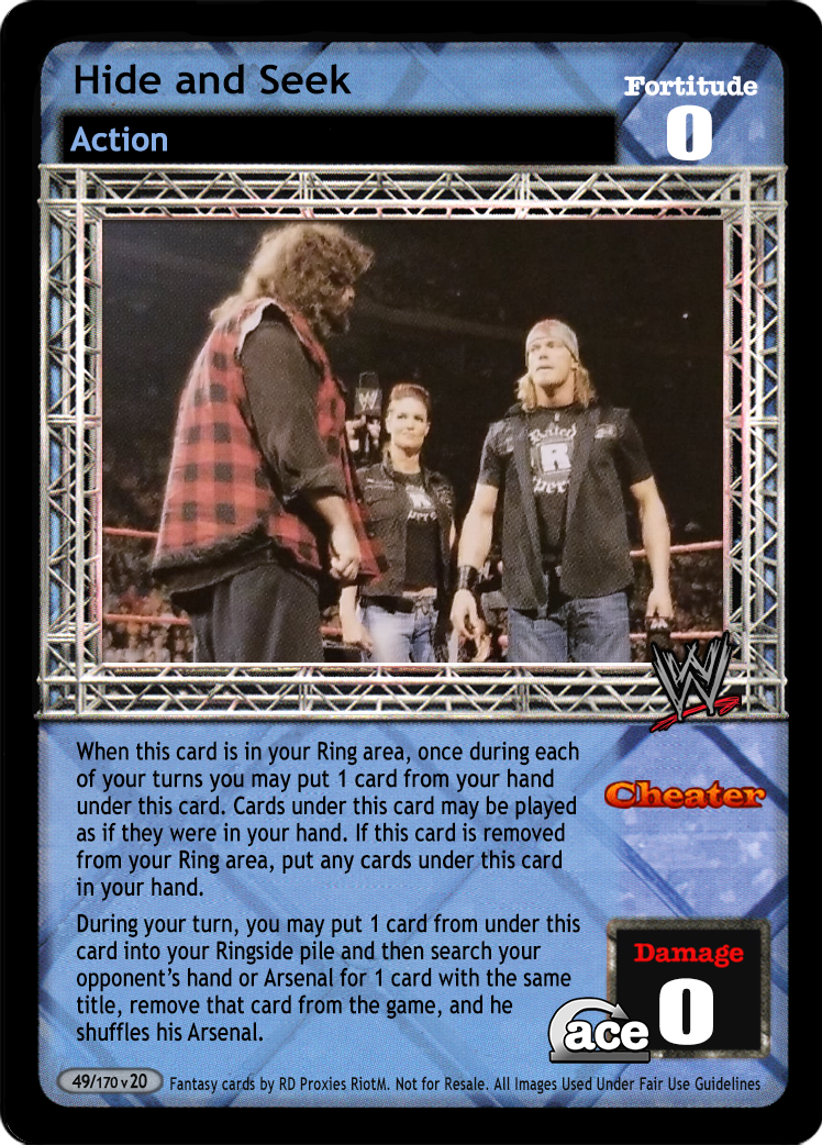 When this card is in your Ring area, once during each of your turns you may put 1 card from your hand under this card. Cards under this card may be played as if they were in your hand. If this card is removed from your Ring area, put any cards under this card in your hand. During your turn, you may put 1 card from under this card into your Ringside pile and then search your opponent's hand or Arsenal for 1 card with the same title, remove that card from the game, and he shuffles his Arsenal.