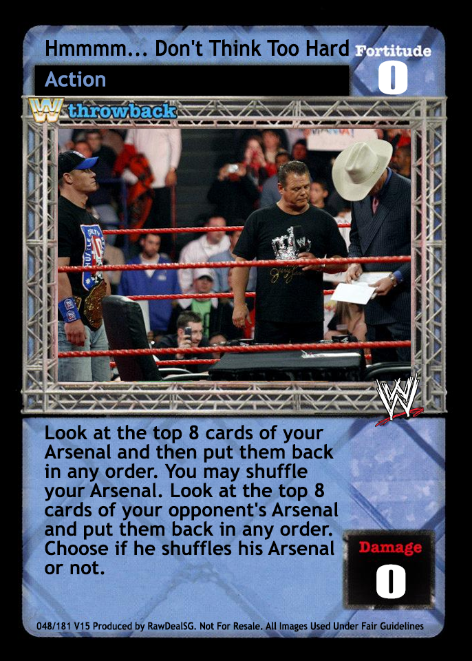 Look at the top 8 cards of your Arsenal and then put them back in any order. You may shuffle your Arsenal. Look at the top 8 cards of your opponent's Arsenal and put them back in any order. Choose if he shuffles his Arsenal or not.