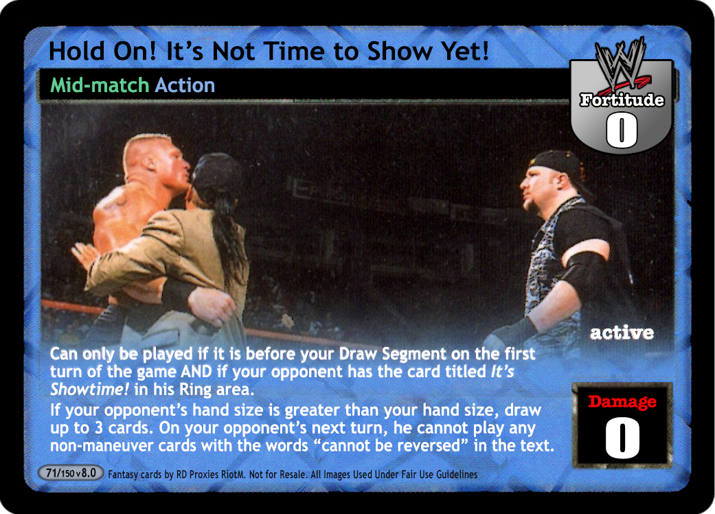 Can only be played if it is before your Draw Segment on the first turn of the game AND if your opponent has the card titled It's Showtime! in his Ring area. If your opponent's hand size is greater than your hand size, draw up to 3 cards. On your opponent's next turn, he cannot play any non-maneuver cards with the words "cannot be reversed" in the text.