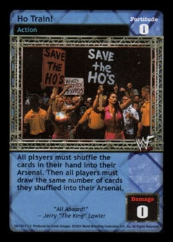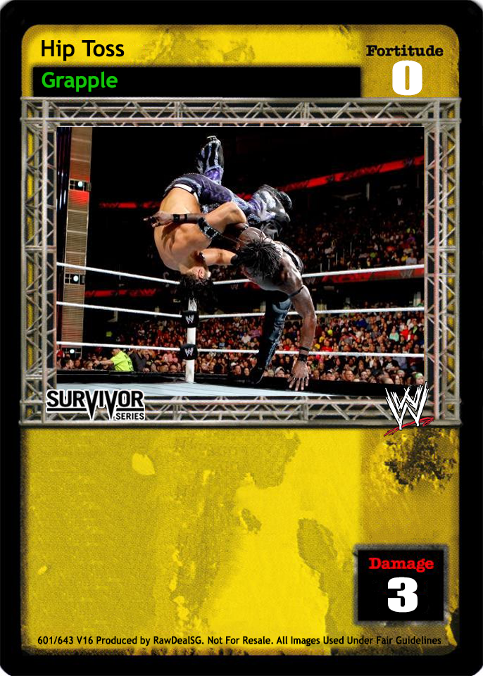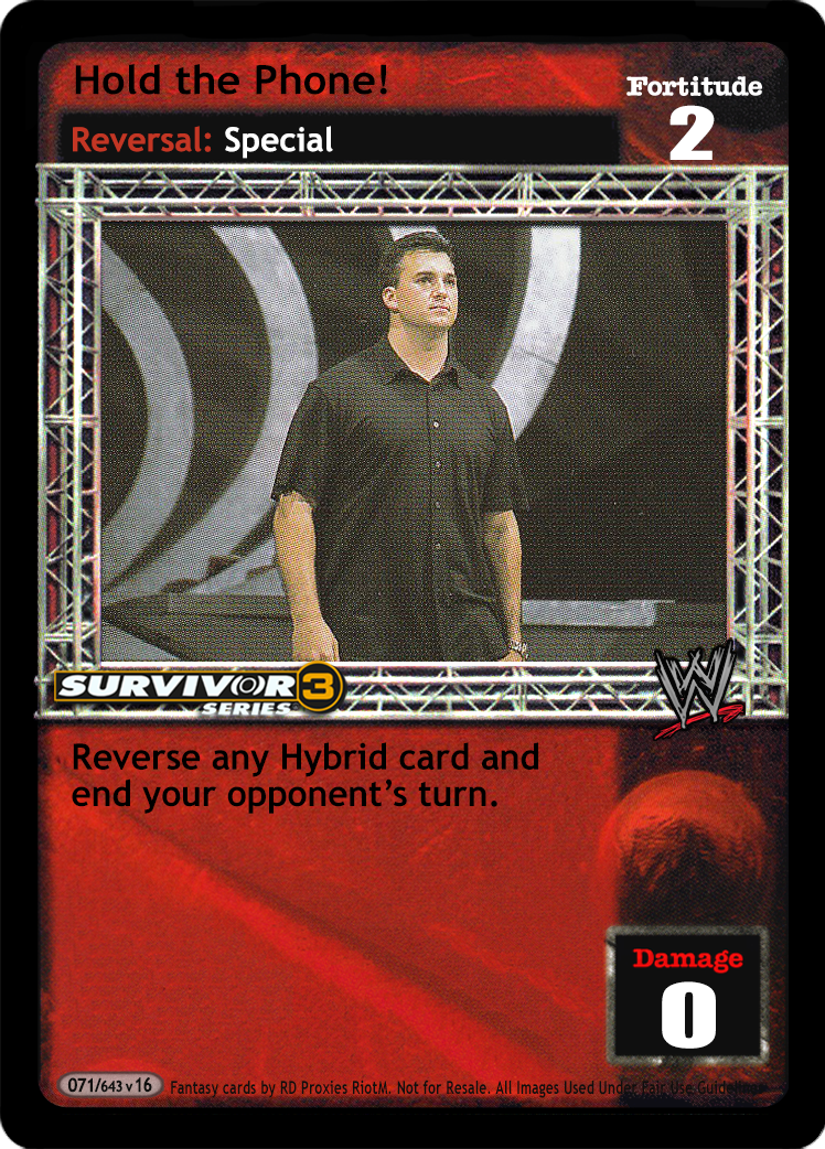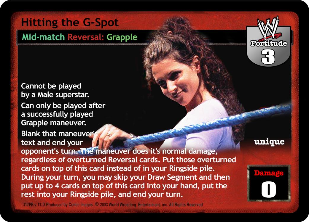 Cannot be played by a Male Superstar. Can only be played after a successfully played Grapple maneuver. Blank that maneuver's text and end your opponent's turn. The maneuver does its normal damage, regardless of overturned Reversal cards. Put those overturned cards on top of this card instead of in your Ringside pile. During your turn, you may skip your Draw Segment and then put up to 4 cards on top of this card into your hand, put the rest into your Ringside pile, and end your turn.