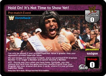 Can only be played if your printed Superstar Value is greater than your opponent's printed Superstar Value. His non-Unique It's Showtime! is blank, and a non-printed ECW Originals Member is no longer a Member and cannot become a Member. ACE: During your turn when you have lower Fortitude, you may remove this card from the game and then shuffle # cards from your Ringside into your Arsenal and draw 2 cards, where # is your printed Superstar Value.