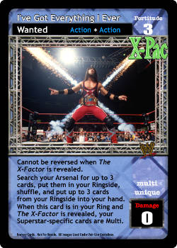 Cannot be reversed when The X-Factor is revealed. Search your Arsenal for up to 3 cards and put them in your Ringside, then put up to 3 cards from your Ringside into your hand. When this card is in your Ring and The X-Factor is revealed, your Superstar-specific cards are Multi.