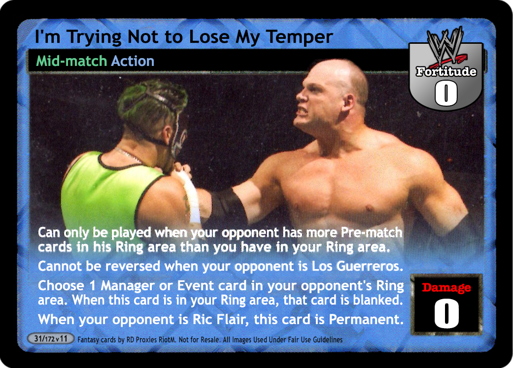 Can only be played when your opponent has more Pre-match cards in his Ring area than you have in your Ring area. Cannot be reversed when your opponent is Los Guerreros. Choose 1 Manager or Event card in your opponent's Ring area. When this card is in your Ring area, that card is blanked. When your opponent is Ric Flair, this card is Permanent.