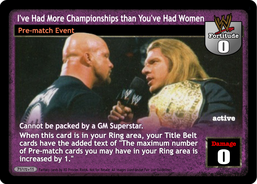 Cannot be packed by a GM Superstar. When this card is in your Ring area, your Title Belt cards have the added text of "The maximum number of Pre-match cards you may have in your Ring area is increased by 1."