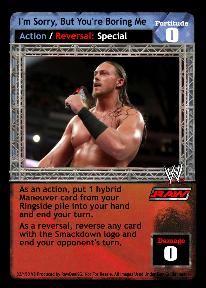 As an action, put 1 hybrid Maneuver card from your Ringside pile into your hand and end your turn. As a reversal, reverse any card with the Smackdown logo and end your opponent's turn.