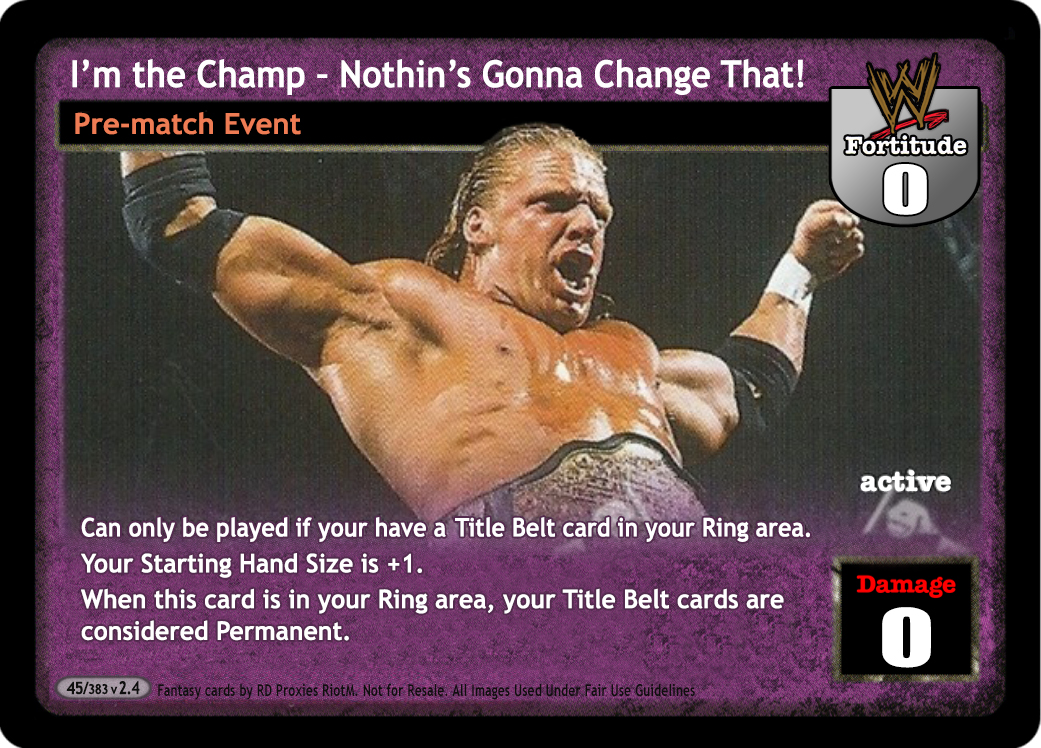Can only be played if your have a Title Belt card in your Ring area. Your Starting Hand Size is +1. When this card is in your Ring area, your Title Belt cards are considered Permanent.