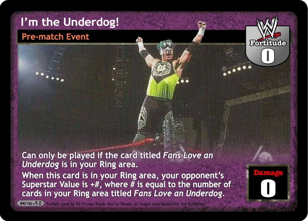 Can only be played if the card titled Fans Love an Underdog is in your Ring area. When this card is in your Ring area, your opponent's Superstar Value is +#, where # is equal to the number of cards in your Ring area titled Fans Love an Underdog.