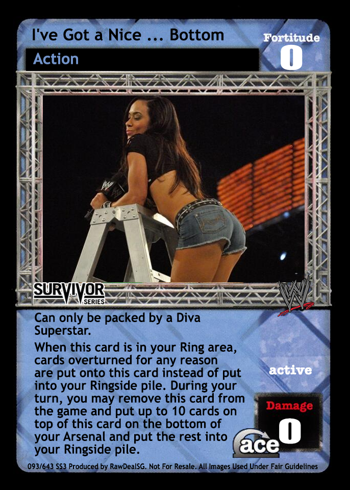 Cannot be reversed when played by a Diva Superstar. When this card is in your Ring area, once during each of your turns, if your Fortitude Rating is greater than your opponent's Fortitude Rating, you may overturn 1 card and then he overturns 2 cards.