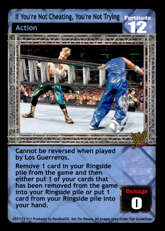 Cannot be reversed when played by Los Guerreros. Remove 1 card in your Ringside pile from the game and then either put 1 of your cards that has been removed from the game into your Ringside pile or put 1 card from your Ringside pile into your hand.