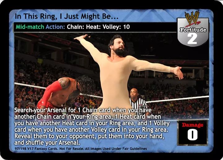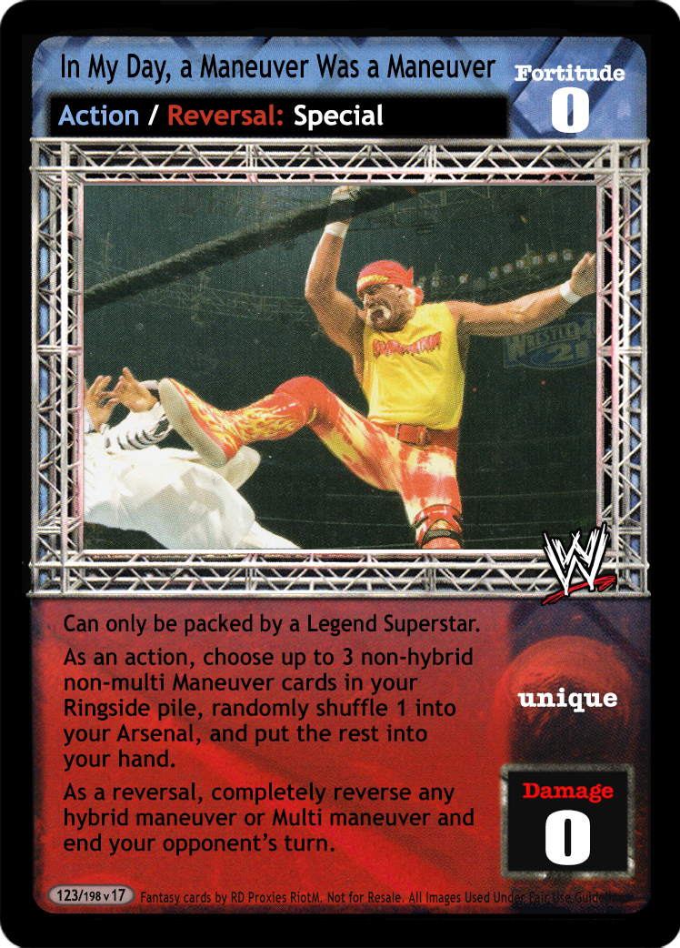 Can only be packed by a Legend Superstar. As an action, choose up to 3 non-hybrid non-multi Maneuver cards in your Ringside pile, randomly shuffle 1 into your Arsenal, and put the rest into your hand. As a reversal, completely reverse any hybrid maneuver or Multi maneuver and end your opponent's turn.