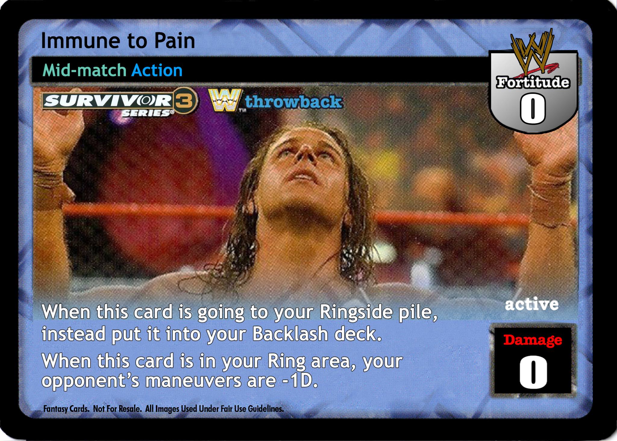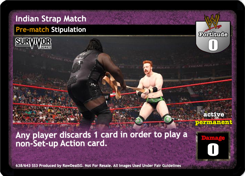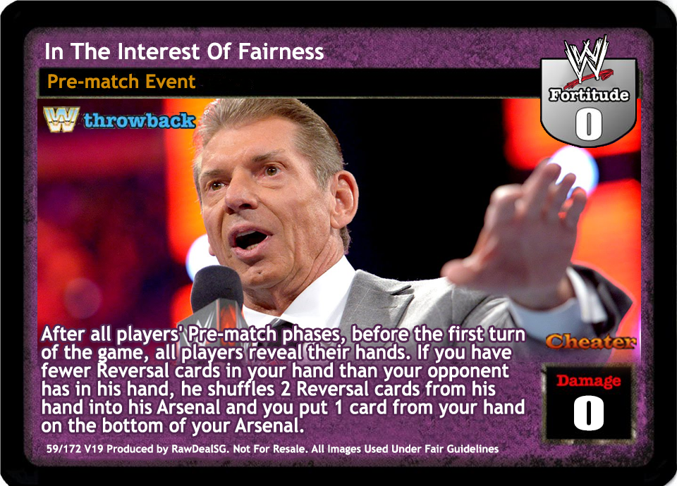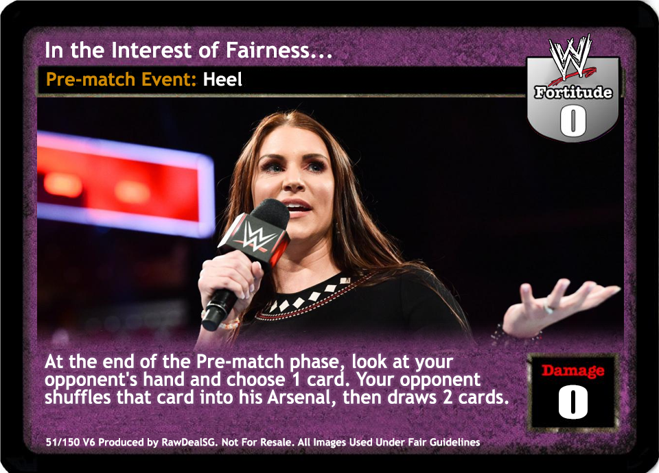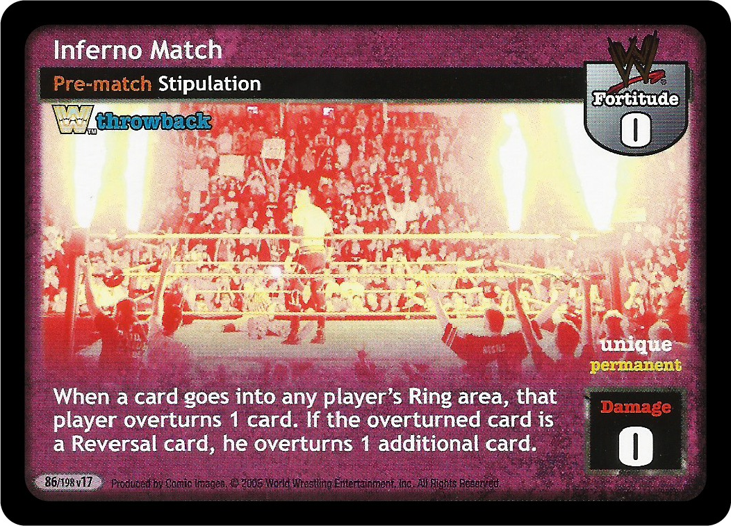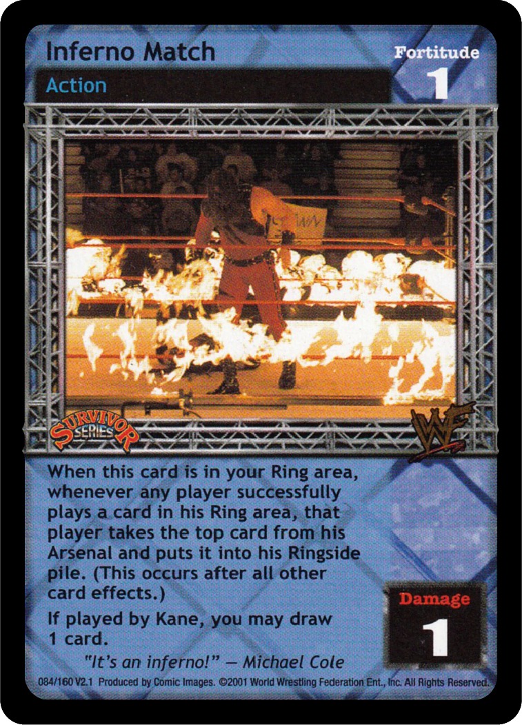 When this card is in your Ring area, whenever a card is successfully played to any player's Ring area, whomever's Ring area the card is going into takes the top card from his Arsenal and puts it into his Ringside pile. (This occurs after all other card effects.) If played by Kane, you may draw 1 card.